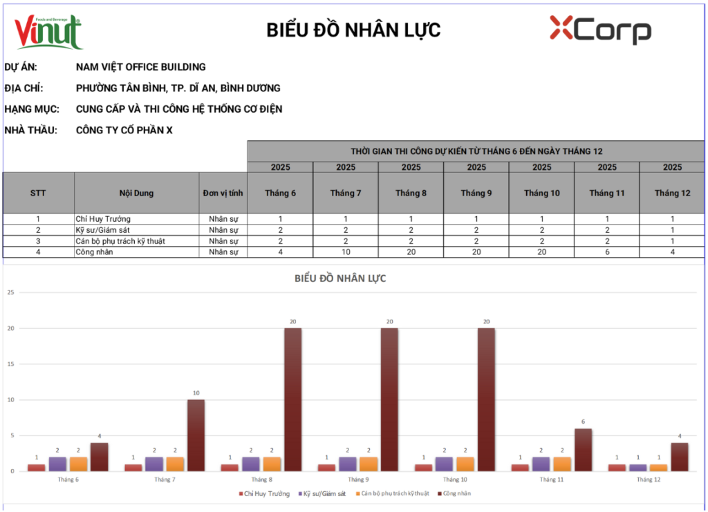Biểu đồ Huy động Nhân lực Thông MinhKhông Lãng Phí Nguồn Lực: Đúng người, đúng việc, đúng thời điểm. Chúng tôi tối ưu hóa kỹ sư và nhân công để duy trì tốc độ thi công ổn định, tránh “khâu chờ khâu” gây trễ nải.