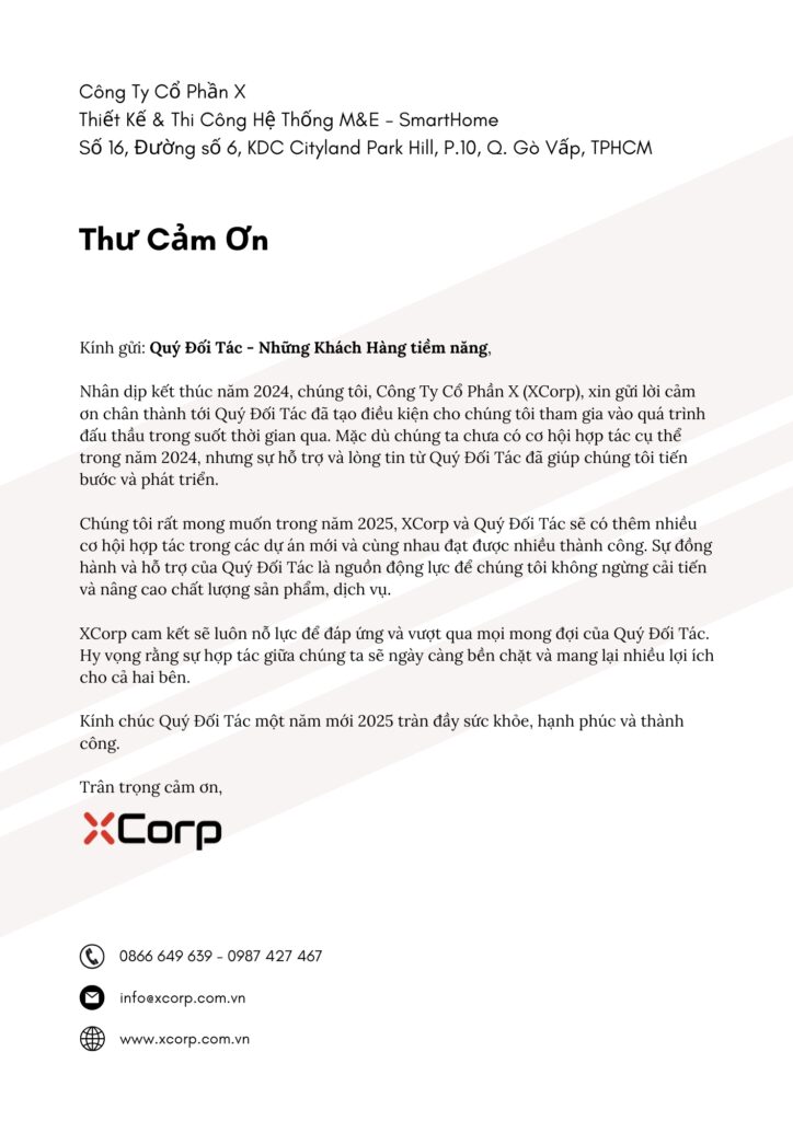 Năm 2024 đã khép lại với nhiều thành tựu và thử thách đáng nhớ. Nhân dịp này, Công Ty Cổ Phần X (XCorp) xin gửi lời cảm ơn chân thành và sâu sắc nhất đến Quý Khách Hàng và Quý Đối Tác – Những Khách Hàng tiềm năng đã luôn tin tưởng, ủng hộ và đồng hành cùng chúng tôi trong suốt năm vừa qua.